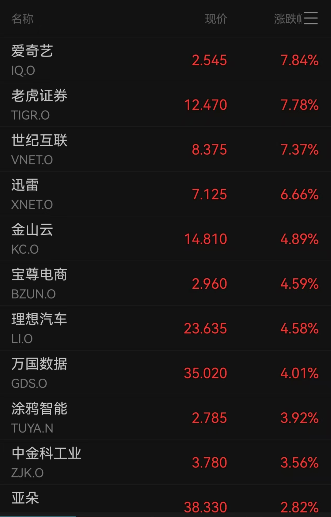 多只绩优中概股上涨,截至23:00左右,纳斯达克中国金龙指数涨约0.2%,爱奇艺、老虎证券、世纪互联涨幅居前,其中多家公司业绩报喜,如老虎证券二季度营收同比增长58.7%,创历史新高;世纪互联二季度营收同比增长22.1%,显示出中概股强劲的增长势头。