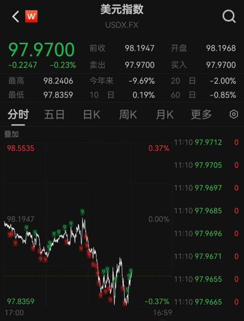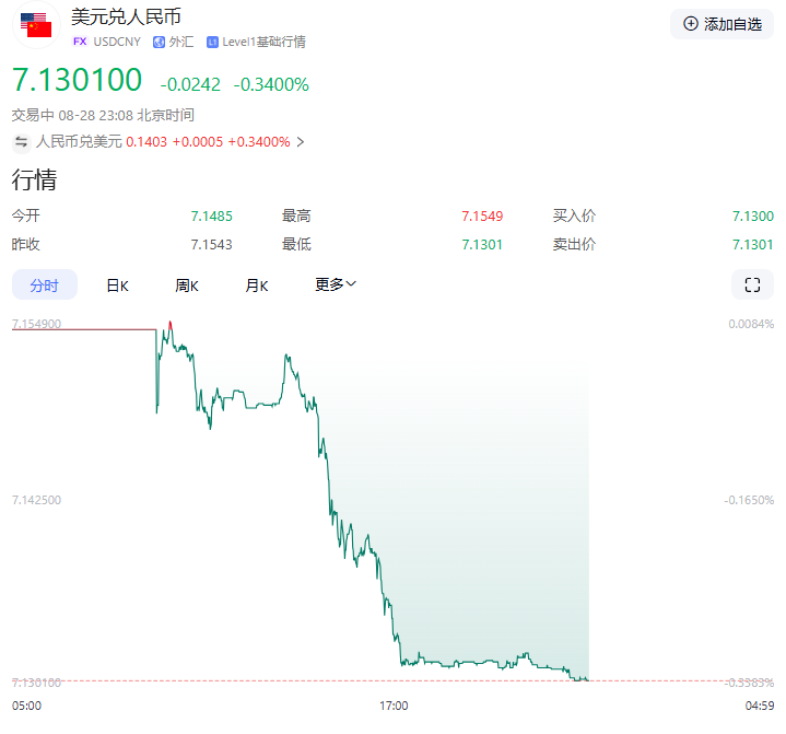 人民币汇率创9个多月新高,8月28日,人民币对美元即期汇率16时30分日间收盘报7.1385,较上一交易日上涨237个基点。进入夜盘交易时间后,人民币对美元即期汇率进一步走强,最高突破7.13,日内升值超300点,创下去年11月7日以来的新高。离岸人民币对美元汇率盘中先后升破7.15、7.14、7.13关口,一度升至7.1250,同样创下去年11月7日以来的新高。同日,人民币对美元中间价调升45个基点,报7.1063,创2024年11月7日以来最高。美元指数8月28日走弱,跌破98,黄金市场也迎来波动,现货黄金一度向上触及3410美元。