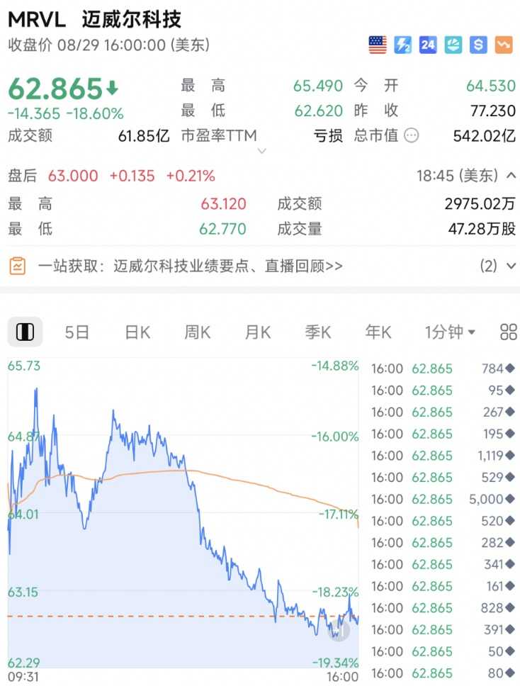 芯片巨头暴跌,市场震动。北京时间8月29日晚间,美股开盘后,迈威尔科技股价直线跳水,一度暴跌近19%,截至收盘,跌幅达18.6%,股价报62.87美元,创近3个月新低,总市值缩水至542亿美元(约合人民币3864亿元)。有分析指出,迈威尔科技在最新披露的财报中给出的业绩指引不及市场预期,引发了投资者对其未来业绩增长放缓的担忧。迈威尔科技预计,第三季度的营收为20.6 亿美元,低于市场预期的21.2亿美元,预计数据中心业务的营收环比不增长;毛利率(GAAP)为51.5%—52%,环比提升,主要来自于下季度定制 ASIC 业务环比下滑,带来的结构性影响。
