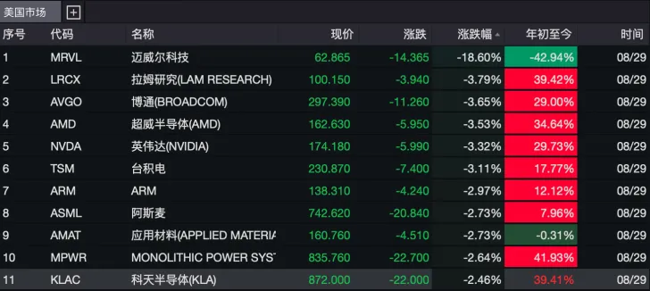 值得注意的是,8月29日,美股芯片股普遍调整,费城半导体指数大跌超3%,博通、超威半导体、英伟达、台积电等均下跌超3%,芯片股整体表现低迷。