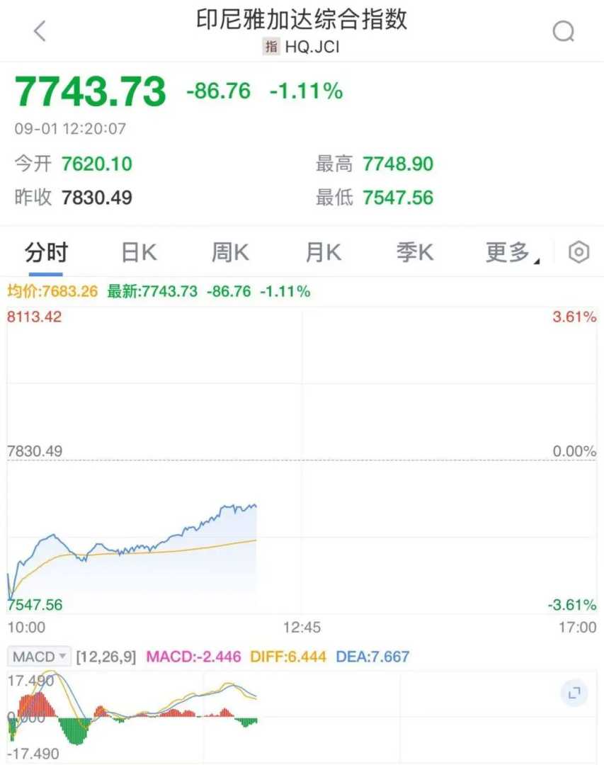 上周五,印度尼西亚股指下跌1.5%,在各国股指中跌幅居首,印尼股市风险凸显。周一,印尼股市继续跌。 雅加达综合指数一度大跌3.6%,创4月8日以来最大跌幅。 DCI Indonesia和Bank Rakyat Indonesia Persero领跌。截至发稿,雅加达综合指数跌幅缩小至1.11%,报7743.73。