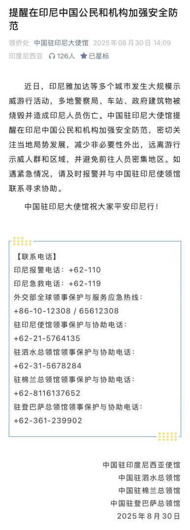 8月30日,中国驻印尼大使馆曾发文:近日,印尼雅加达等多个城市发生大规模示威游行活动,多地警察局、车站、政府建筑物被烧毁并造成印尼人员伤亡。中国驻印尼大使馆提醒在印尼中国公民和机构加强安全防范,密切关注当地局势发展,减少非必要性外出,远离游行示威人群和区域,并避免前往人员密集地区。如遇紧急情况,请及时报警并与中国驻印尼使领馆联系寻求协助。