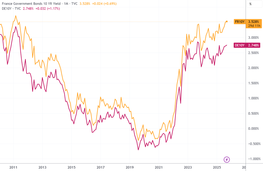 与此同时,法国10年期国债与德国国债的利差(反映市场对欧洲主权债务风险的担忧水平)也逼近2012年欧债危机以来的最高水平,债务问题凸显。