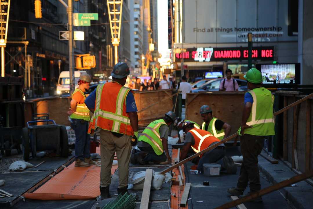 6月24日,建筑工人在美国纽约曼哈顿街头工作。新华社记者刘亚南摄