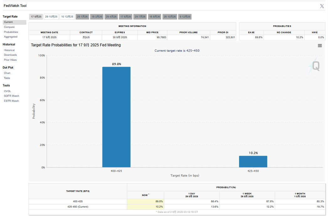 关于关税对通胀的影响,鲍威尔表示,一种“合理的基准假设”是,关税会导致物价水平“一次性”上涨,但这些影响需要时间才能完全体现在经济中。在鲍威尔讲话后,包括摩根士丹利、巴克莱、法国巴黎银行和德意志银行在内的国际投行纷纷加大了对美联储降息的预期。根据芝加哥商品交易所集团(CME Group)的FedWatch工具,目前美联储9月降息的可能性高达89.8%,而按兵不动的可能性仅为10.2%。