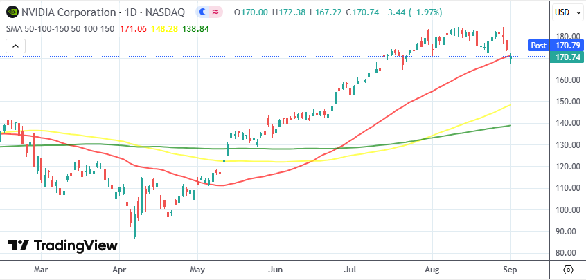 周二(9月2日)盘中,英伟达股价一度跌约4%至每股167.22美元,为7月22日以来的最低水平。