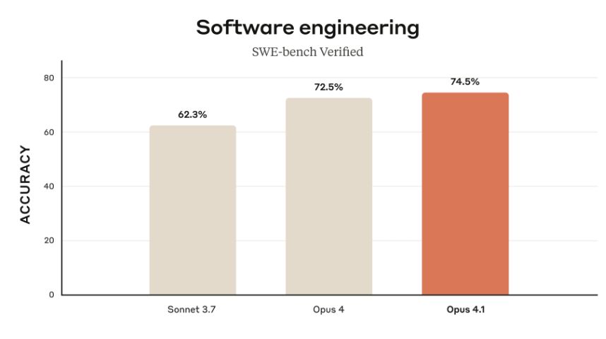 据Anthropic介绍,在SWE-bench Verified基准测试中,Opus 4.1的编码性能达到74.5%,相比前一版本Opus 4提升了2个百分点,而相较于Sonnet 3.7的提升更为明显,后者得分仅为62.3%,展现了其技术实力的飞跃。