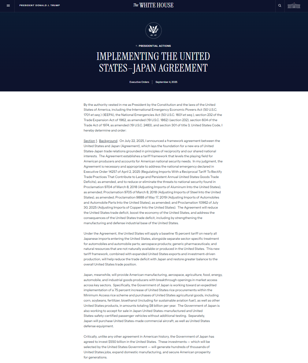 行政命令中写道:"根据该协议,美国将对几乎所有进入美国的日本进口产品征收15%的基准关税,同时对汽车和汽车零部件、航空航天产品、仿制药以及美国无法自然获得或生产的自然资源实施单独的行业特定待遇。"白宫强调,此举旨在平衡美日贸易,促进公平竞争。与此同时,白宫指出,日本将为美国制造业、航空航天、农业、食品、能源、汽车和工业品生产商提供关键领域市场准入的突破性开放。具体而言,日本政府正致力于加快实施"最低准入"大米计划,将美国大米采购量增加75%,并购买包括玉米、大豆、化肥、生物乙醇以及其他美国产品在内的美国农产品,总额达每年80亿美元。