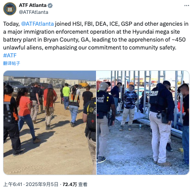 作为事件的开头,据美国烟酒枪炮及爆裂物管理局(ATF)亚特兰大分局在社交媒体上分享称,该局与ICE(美国移民与海关执法局)、FBI等执法机构一起,对佐治亚州的现代汽车大型电池工厂进行了“重大移民执法行动”,当场逮捕了约450人。