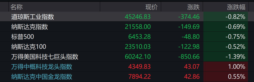 9月5日晚,美股开盘三大指数全线上涨,均创历史新高,但截至23:00,美股三大指数全线跳水,道指跌0.82%,纳指跌0.69%,标普500跌0.75%。纳斯达克100指数转跌,抹去此前近1%的涨幅。万得美国科技七巨头指数跌1.39%,而中概股走势坚挺,纳斯达克中国金龙指数涨0.55%,万得中概科技龙头指数涨1%,显示出市场资金的分流现象。
