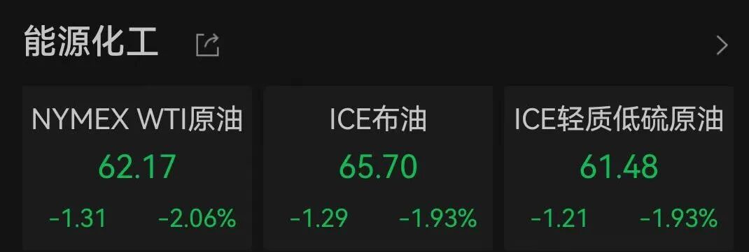 原油市场方面,截至22:28,NYMEX WTI原油跌幅扩大至2%,报62.17美元/桶,大宗商品市场整体承压。