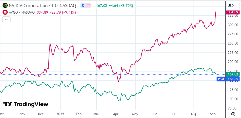 “今天两者的分化看起来有点极端,但英伟达在过去三年一直是AI的代表企业。虽然我不认为市场对它降温,但投资者正在把目光拓展到其他AI赢家身上。博通算是一个相对崭新的亮点,AI市场多元化趋势显现。”
