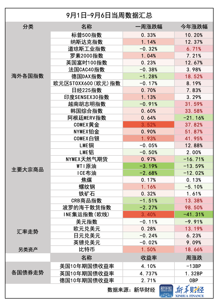 新华财经上海9月7日电(葛佳明) 本周(9月1日至6日),美国多项就业数据走弱,8月非农就业数据仍低于预期,前两月数据再度下修,失业率攀升。市场对美联储降息预期明显升温,美元走弱,黄金作为避险资产持续刷新历史新高,成为本周金融市场焦点。
