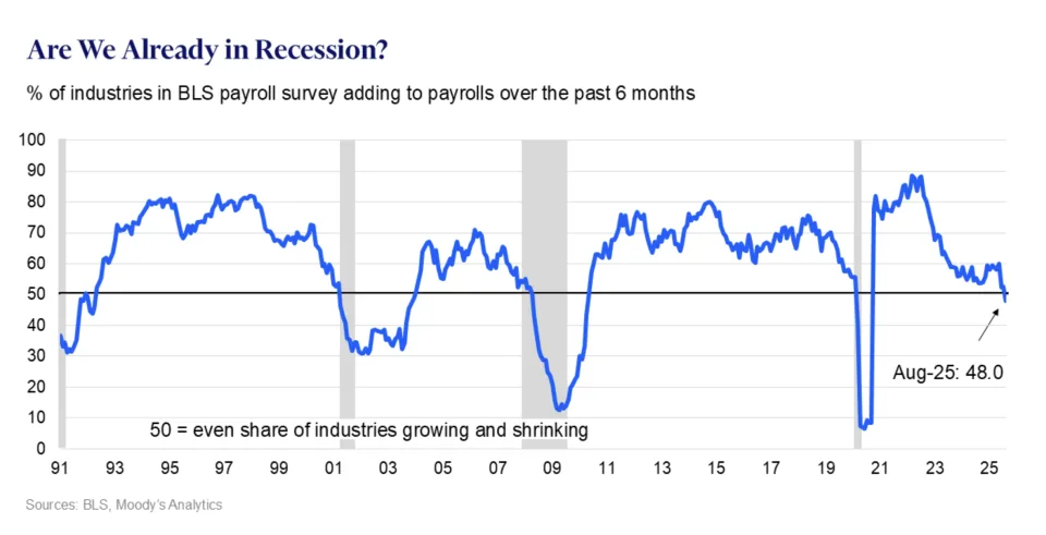 赞迪还指出,在劳工统计局追踪的行业中,在过去六个月里,只有不到一半的行业增加了就业人数,并补充说,‘这种情况只会在经济衰退时发生’,经济衰退风险加剧。