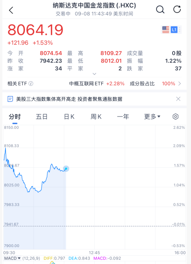 8月PPI和CPI即将公布,市场押注美联储可能降息。此外,中概股指数大涨超1.5%,36氪股价盘中一度暴涨超300%,6次触发熔断,市场反应热烈。