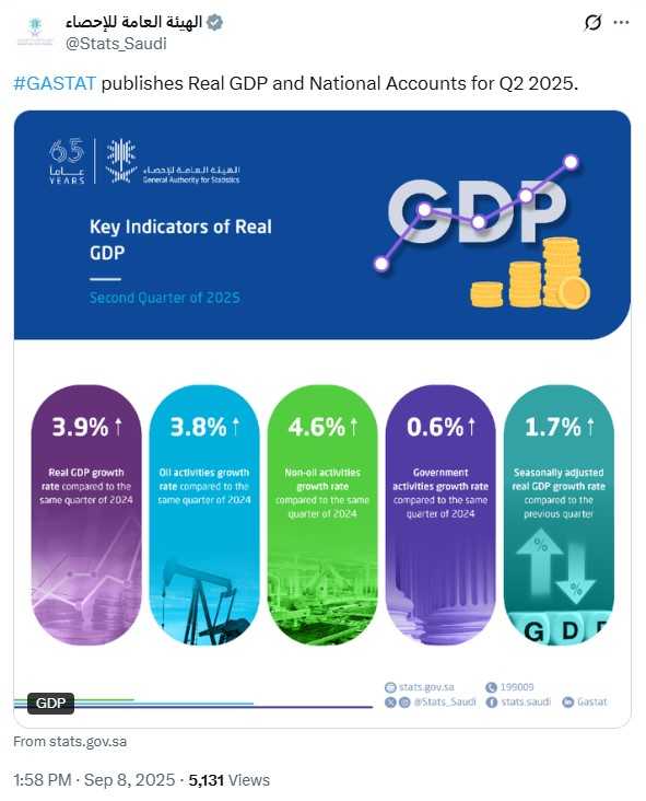 根据沙特阿拉伯统计总局(GASTAT)公布的最新数据,该国2025年第二季度实际国内生产总值(Real GDP)增长3.9%,非石油部门以4.6%的增速居首,推动其连续18个季度稳定增长,成为沙特经济增长亮点。数据显示,经济增长得益于所有重要经济领域均实现基础性增长:非石油部门以4.6%的增速居首,石油部门以3.8%紧随其后,政府活动则增长0.6%。