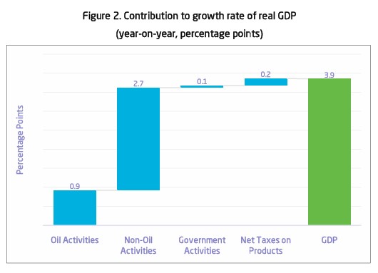 在政府主导的激励措施和大型项目投资推动下,零售、酒店、运输、物流及商业服务等非石油部门持续保持稳健发展势头,成为整体经济增长的主要引擎,为GDP增长贡献2.7个百分点,石油相关活动则贡献0.9个百分点,印证了沙特“2030愿景”战略在推动经济摆脱石油依赖方面取得显著成效,沙特经济多元化趋势明显。