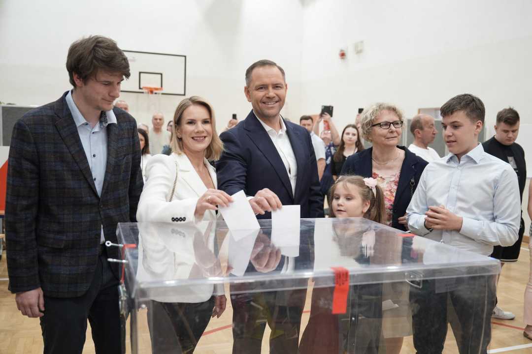 6月1日,独立候选人卡罗尔·纳夫罗茨基(左三)和家人在波兰首都华沙一处投票站投票。新华社发(亚普·阿林摄)