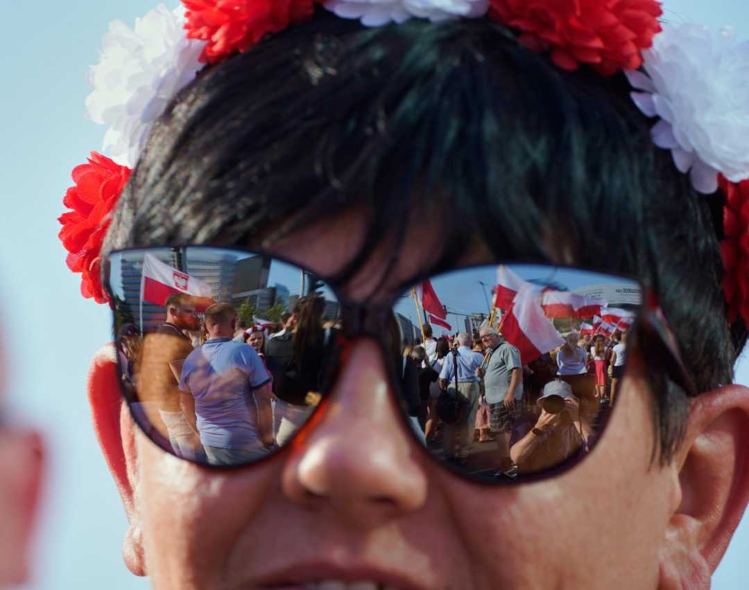2024年8月1日,在波兰首都华沙,一名市民的眼镜上映射出参加华沙起义80周年纪念活动的人们。新华社发(亚普·阿林摄)