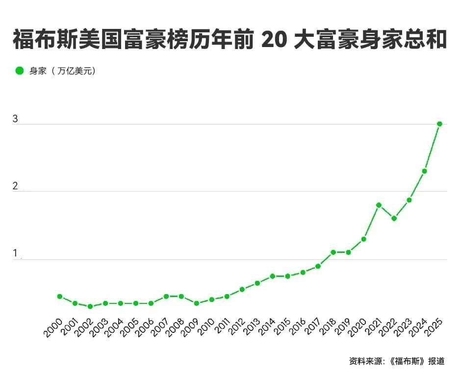 全美最富有的20人总身家达3万亿美元,几乎占美国亿万富豪总财富的一半,较去年的2.3万亿美元显著增长。