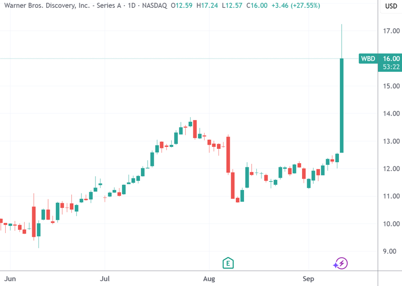 财联社9月12日讯(编辑史正丞)美股周四盘中,美国大型媒体集团华纳兄弟探索公司股价异动拉升,一度涨超30%。市场消息称,上个月才刚完成派拉蒙并购交易的埃里森家族,将财大气粗地发起另一项巨额收购交易,或引发传媒行业格局重塑。
