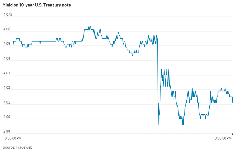 Tradeweb数据显示,10年期美债收益率隔夜盘中一度跌至3.996%,尾盘最终下跌2.29个基点报4.024%,为4月4日以来的最低收盘水平。