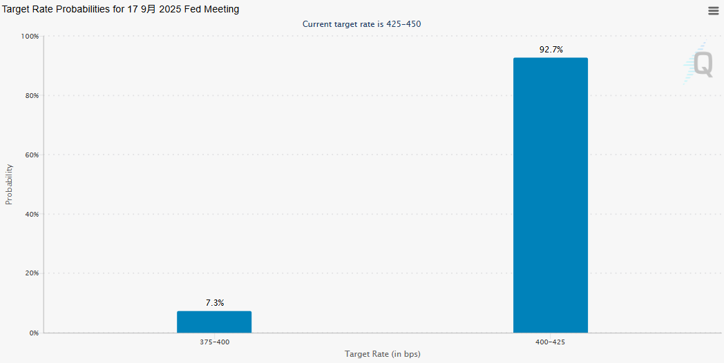 根据芝加哥商品交易所的FedWatch工具显示,在周四的多组美国数据公布后,联邦基金利率期货市场目前认为本月降息25个基点的可能性为92.7%,降息50个基点的可能性为7.3%。与周三晚些时候的预期基本一致。