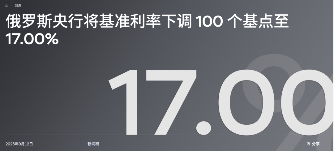 以下是俄罗斯央行声明全文。2025年9月12日,俄罗斯央行委员会决定将关键利率下调100个基点至年化17.00%。当前价格涨幅的底层衡量指标未出现显著变化,总体仍维持在年化4%以上。经济持续回到均衡增长轨道。近几个月信贷增长加快。通胀预期依然偏高。俄罗斯央行将根据需要维持足够紧的货币条件,以确保通胀在2026年回到目标水平。后续关键利率决策将取决于通胀放缓的持续性及通胀预期的变化。根据俄罗斯央行的预测,在既定货币政策立场下,2025年全年通胀将降至6.0%–7.0%,在2026年回到4.0%,并在此后维持在目标附近。