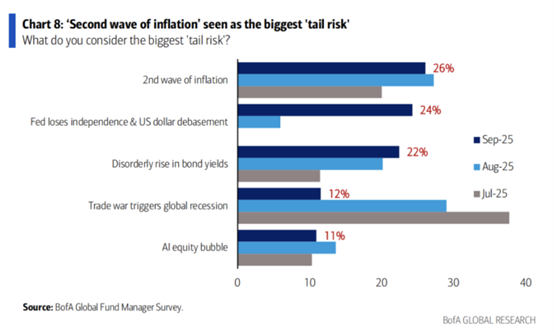 美国银行最新发布的9月《全球基金经理调查》显示,市场最担忧的风险发生转变,眼下“第二波通胀”已经取代“贸易战引发全球衰退”,被视为最大的尾部风险,这凸显了通胀风险对市场的影响。