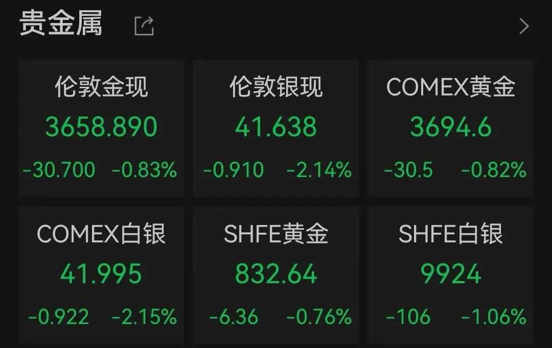 美联储决议公布后,现货黄金刷新纪录高位至3704美元/盎司,年内累涨超40%,随后收窄涨幅,后继续下挫,跌超1%,最终日内跌幅收窄至0.83%,报3658.89美元/盎司;现货白银一度跌超3%,后跌幅收窄至2.14%,报41.638美元/盎司。