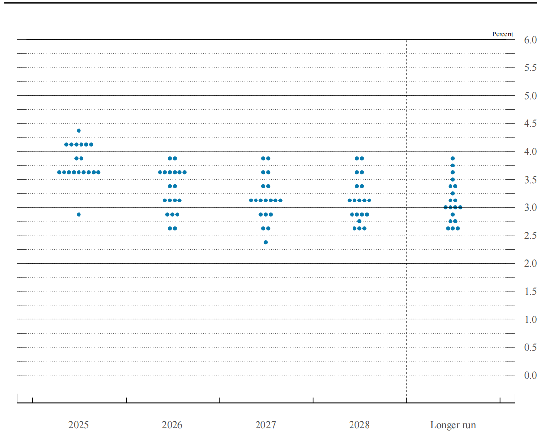 对2025年联邦基金利率的中值预测由3.9%下调至3.6%,对2026年联邦基金利率的中值预测则由3.6%下调至3.4%。长期中性利率预期值维持在3%。本次点阵图中,有6人支持将2025年联邦基金利率的目标区间维持在当前的4%-4.25%区间,9人支持年内再降息50个基点至3.5%-3.75%,1人支持年内再降息125个基点。不过,点阵图的预测只代表美联储官员当前的预测,往往与真实利率政策路径存在差异。