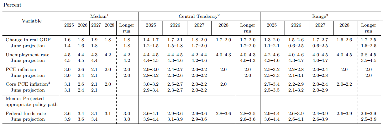 9月会议还发布了对通胀、失业率和经济增长的预期。美联储对今年美国经济增速的预测由1.4%上调至1.6%,较6月预测上调0.2个百分点;对2026年经济增速的预测由1.6%上调至1.8%,2027年的预测增速由1.8%上调至1.9%。预测今年的失业率为4.5%,与6月预测持平;预测今年PCE(个人消费支出)通胀为3%(6月预测值3%),2026年将回落至2.6%(6月预测值2.4%);预测今年核心PCE通胀为3.1%(6月预测值3.1%),2026年将回落至2.6%(6月预测值2.4%)。