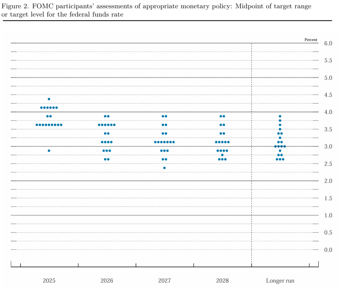 点阵图上,新任理事斯蒂芬·米兰(Stephen Miran)的预期最为激进,他主张9月降息后,年内再额外降息至少100个基点。而点阵图显示,2025年至2028年底联邦基金利率预期中值逐步下降,长期预期稳定在3.0%。新任理事米兰是唯一反对25个基点降息的决策者,他更倾向于50个基点的降息幅度。