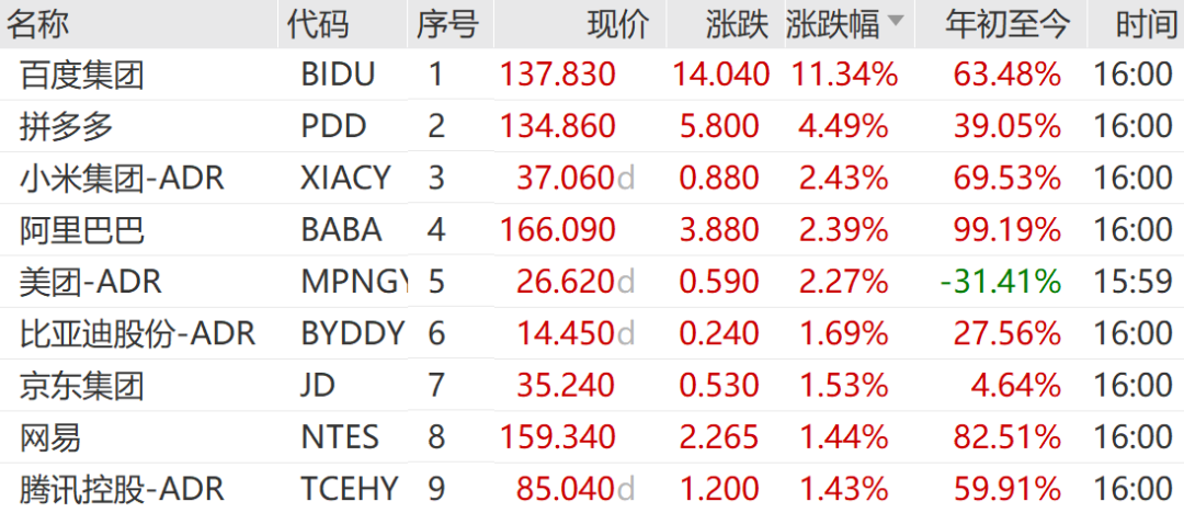 中概股逆势大涨!纳斯达克中国金龙指数涨2.85%,万得中概科技龙头指数涨2.31%。个股方面,百度集团大涨11.34%,拼多多涨4.49%,领涨万得中概科技龙头指数成份股。热门中概股中,盛美半导体涨逾9%,万国数据涨超7%,表现抢眼。