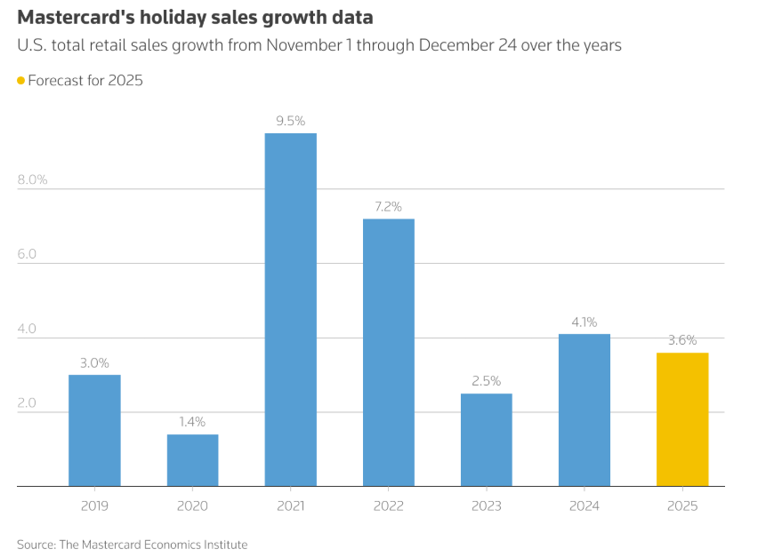 每年感恩节到圣诞节期间的假日购物季,是美国零售商一年当中最为关键的销售期。然而,今年对于美国零售商们来说,销售前景尤其严峻,因为特朗普政府多变的贸易政策增加了商品成本,并抑制了需求。万事达卡经济研究所的报告预测,今年美国假日季(11月1日至12月24日)期间,美国的零售销售额将仅增长3.6%,而去年同期的增长率为4.1%。