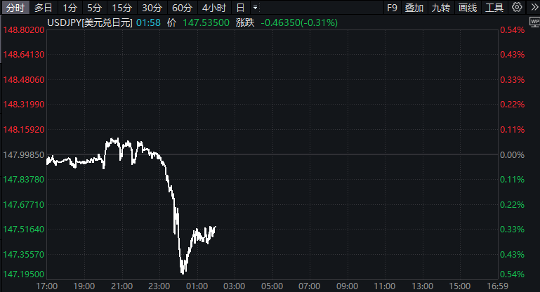 外汇市场上,美元兑日元汇率也在日内亚洲时段经历了剧烈波动——最新下跌至147.50,在日本央行决议后一度跳水约80点。