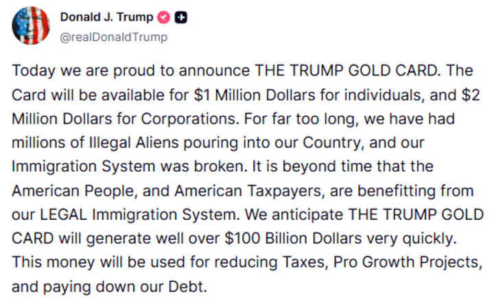 值得注意的是,特朗普当天还签署一项名为“黄金卡”的行政令,称其将为具有非凡能力并愿意支持美国的外国人开辟一条新的“签证通道”:个人向美国财政部缴纳100万美元,或者由企业赞助缴纳200万美元,该外国人就能通过这一“黄金卡”项目获得加速审批的签证待遇。