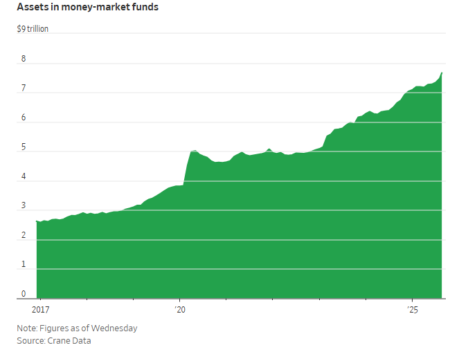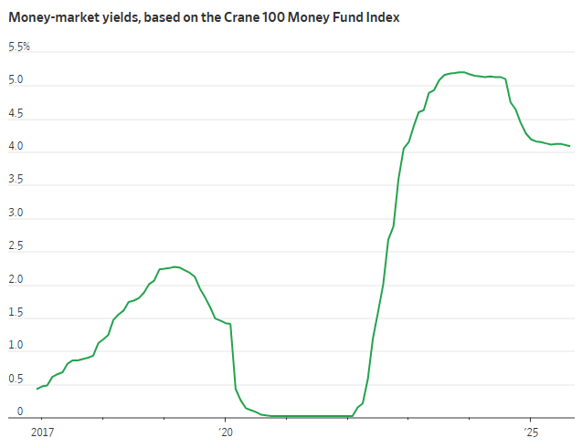 不少业内人士预计,即便美联储重启降息,这一局面短期内也不太可能改变。当前货币市场基金收益率仍远高于2010年代及2020年代初水平——当时金融危机和新冠疫情曾将利率压至极低。鉴于股市估值已达历史高位,部分投资者更愿等待估值回落再调整资产配置。而想要促使他们改变投资策略,仅靠一两次降息显然远远不够。