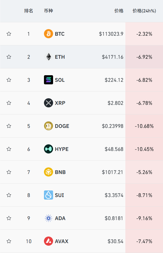 刚刚,加密货币市场遭遇集体大跳水,市场避险情绪升温!数据显示,过去24小时主流加密货币价格集体走低,BTC、ETH、DOGE等品种跌幅显著,市场整体出现短时急跌。