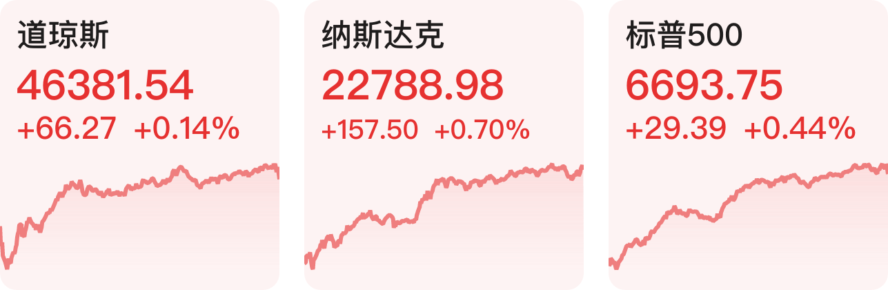 美股三大指数集体收涨,道指涨0.14%,纳指涨0.7%,标普500指数涨0.44%,大型科技股多数上涨,甲骨文涨超6%,苹果涨超4%(苹果股票表现亮眼),英伟达涨近4%,亚马逊、Meta跌超1%。热门中概股多数下跌,蔚来跌超6%,京东跌超3%,名创优品跌超2%;世纪互联涨超4%,爱奇艺涨超3%。