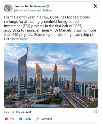 财联社9月23日讯 在2025年上半年,中东明星城市迪拜继续保持其绿地外国直接投资(FDI)的领先地位,项目数量创下全球纪录,彰显了其经济多元化战略的稳步推进。作为全球投资热点,迪拜的绿地FDI项目不仅数量领先,更在质量上有所提升。