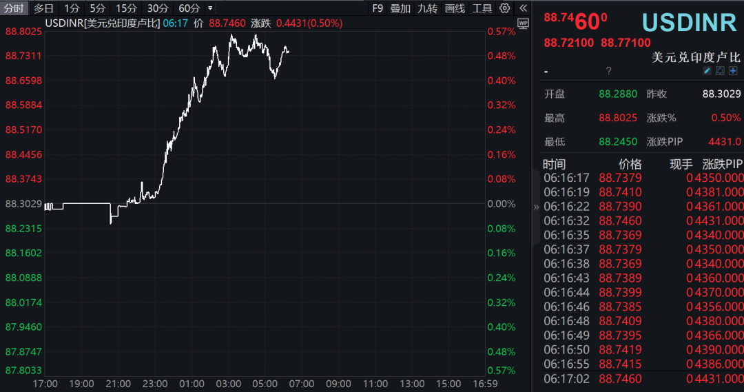 9月23日盘中,印度汇率再度跳水,卢比兑美元跌跌幅一度接近0.6%并跌破88.80,再创历史新低,外汇市场波动引发关注。自上周四以来,卢比兑美元累计跌幅接近1%。有交易员称,印度央行可能会通过国有银行出售美元以支撑卢比。(外汇资讯)