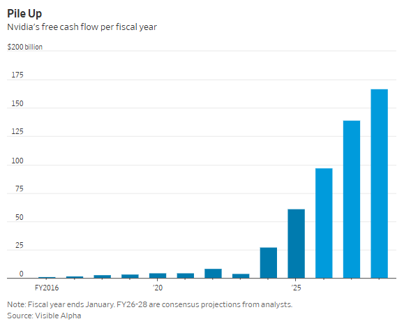 考虑到三年前英伟达的年自由现金流仅略超60亿美元,投向OpenAI的1000亿美元数字看起来无疑显得尤为惊人。然而,近年来全球人工智能热潮及其引发的军备竞赛,不仅使英伟达成为全球市值最高的企业,也确实正使其跻身资金最雄厚的公司之列!
