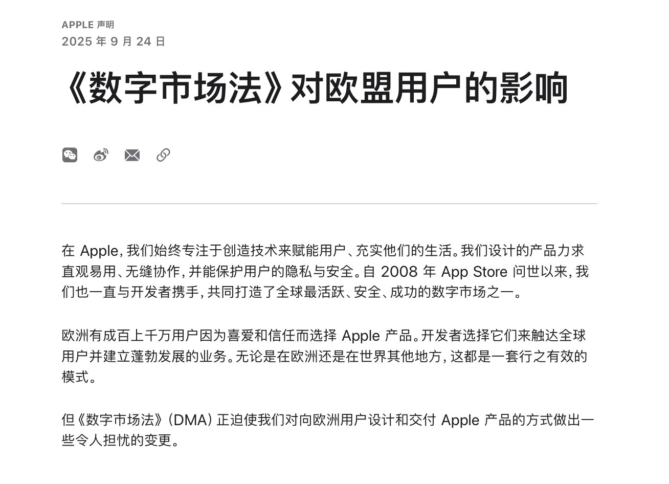 9月24日,苹果在官网发布声明,直指欧盟的《数字市场法》(DMA)影响了苹果欧盟用户多方面的产品体验。苹果表示,“DMA对市场并没有起到促进作用。相反,它让企业在欧洲开展业务变得更加困难。”此声明一出,立即引发了业界对欧盟法规与科技企业发展的深入思考。