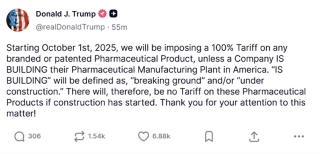 其中,特朗普写道,“从2025年10月1日开始,我们将对任何品牌或专利药品征收100%的关税,除非一家公司正在美国建立他们的制药工厂。‘IS BUILDING’将被定义为‘破土动工’和/或‘在建’。因此,如果建设已经开始,将不会对这些药品征收关税。感谢您对此事的关注!”这一药品关税政策的出台,迅速引发了全球市场的反应。9月26日上午,亚太市场医药板块普遍走低。A股医药生物板块走低,减肥药、创新药、CRO等指数跌幅居前。