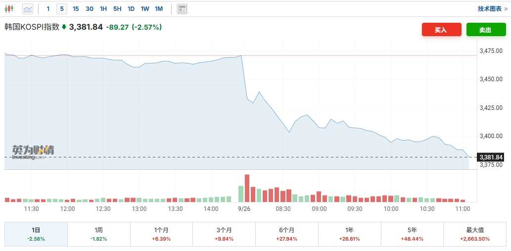 同样地,韩国股市中的权重医药股——三星生物(Samsung Biologics)和SK生物制药(SK Bio Pharmaceuticals)也分别下跌1.66%和2.66%。截至11:30左右,韩国KOSPI指数整体也已跌去2.56%,跌幅不断扩大,领跌亚太主要股指,韩国医药板块承压。