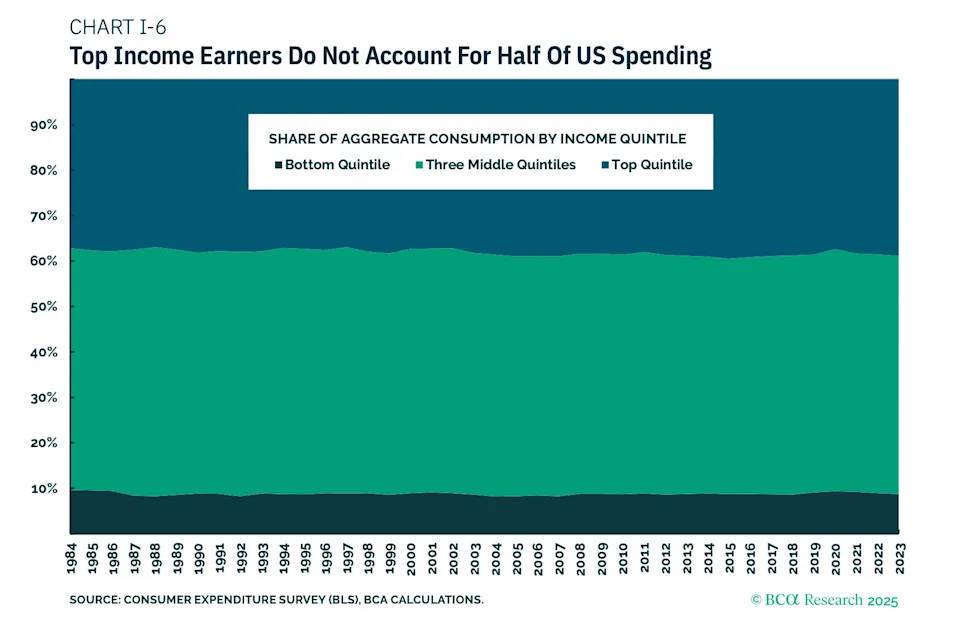 根据BCA Research的分析,美联储消费者财务调查的数据显示,收入最高的10%的人占美国所有家庭收入的一半左右,但这并没有直接转化为支出。