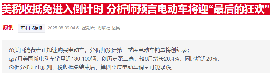 今年7月,美国国会两院通过了美国总统特朗普力推的“大而美”法案。法案中规定,美国政府从9月30日起将不再为电动汽车提供最高每辆7500美元的税收抵免。