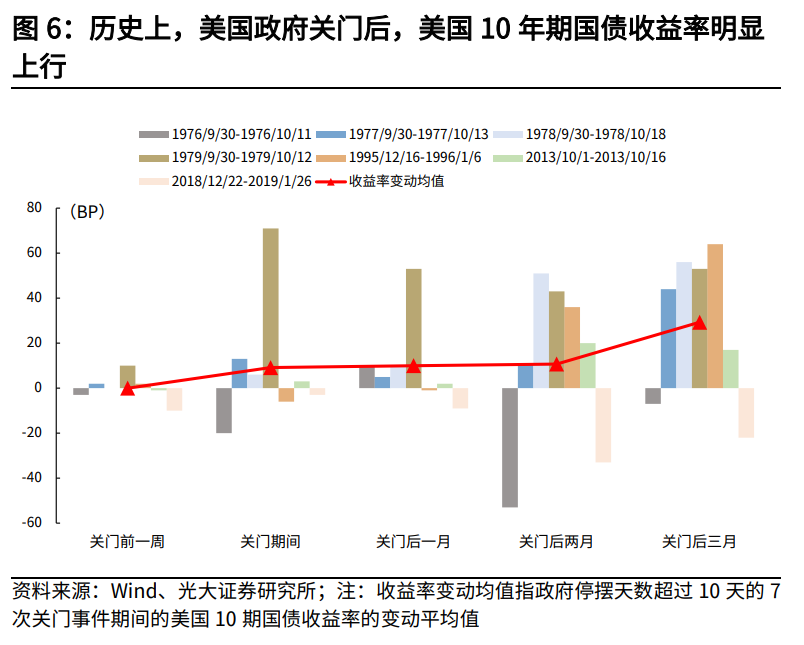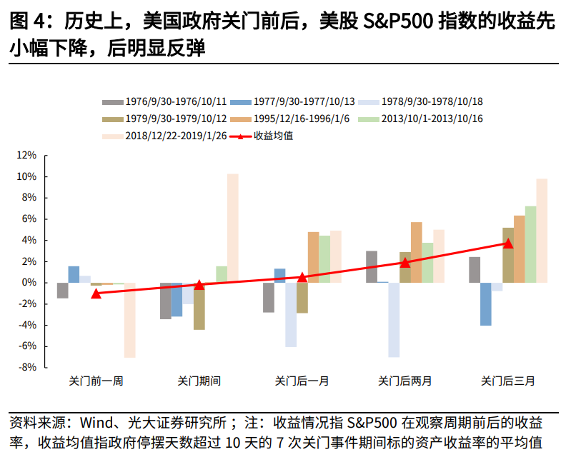 从历史上看,不同资产对政府“停摆”的反应各异。据光大证券研报,政府关门期间,美国股市4次下跌,3次上涨,标普500平均累计下跌0.2%,在关门前一周平均下跌1.0%,在政府“开门”后1至3个月内,美股开始复苏。在过去政府停摆天数超过10天的7次关门事件中,“关门”期间及“开门”后3个月内,10年期美国债收益率均值普遍上涨。研报指出,在政府停摆天数超过10天的7次“关门”事件中,黄金收益率均值均实现上涨,而且,政府“关门”时间越长,黄金涨幅越大。