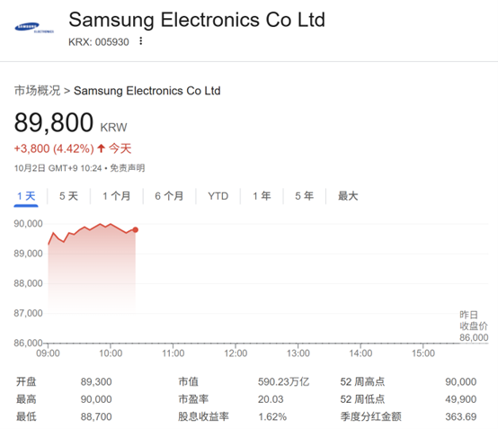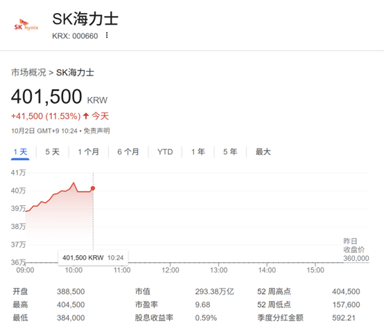 截至目前,三星股价上涨逾4%,创下2021年1月以来的最高水平,而SK海力士股价升至历史高位,目前涨幅为逾11%。今年以来,三星股价已经上涨了近70%,而SK海力士股价已经翻了一倍有余。上述两家芯片巨头股价大涨助力韩国基准股指KOSPI指数大涨,目前该指数涨幅扩大至3.2%,创历史新高。